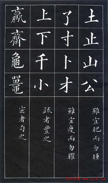(16)左右有豎畫的字,左邊應收而右邊伸展。如:目、自、因、固